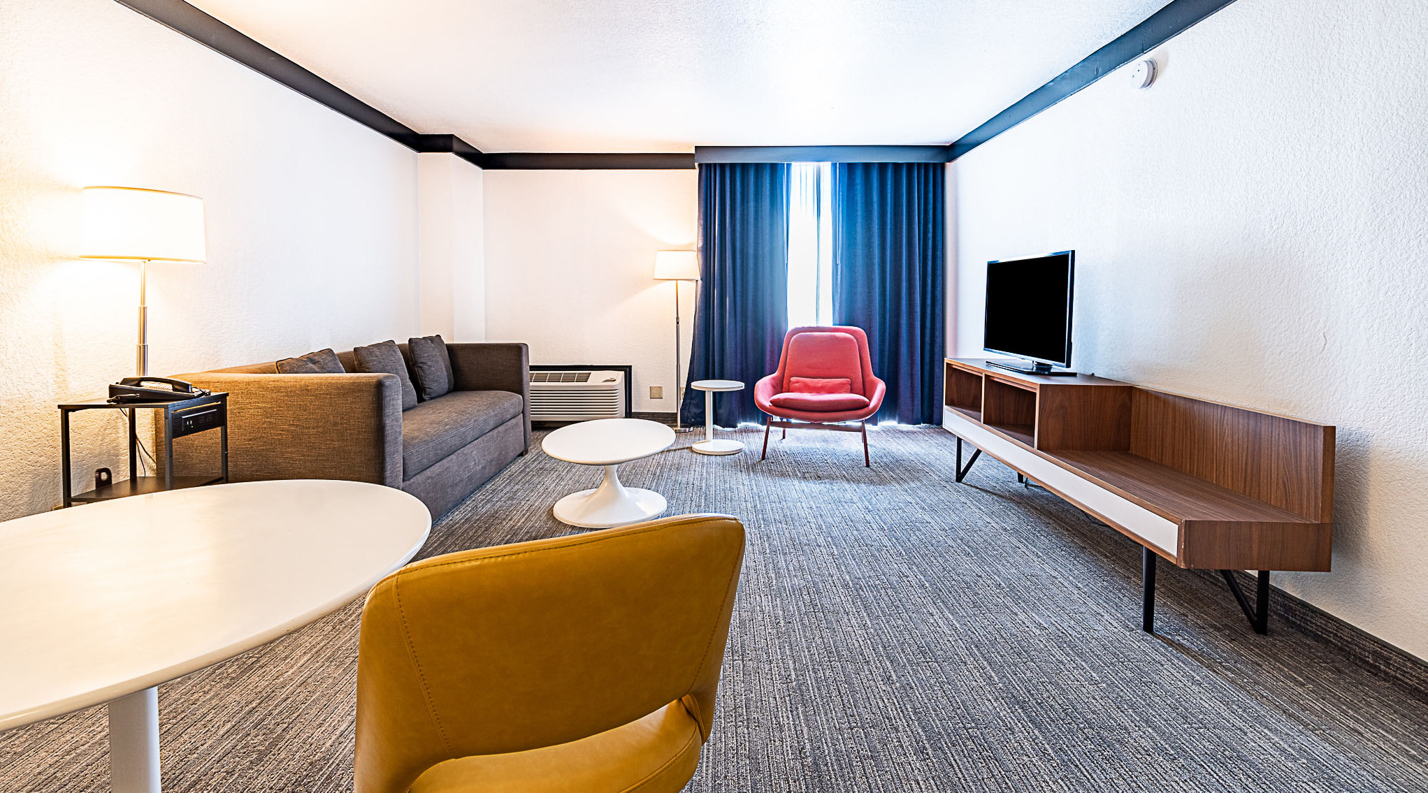 This roomy 350 to 370 square-foot room has modern décor with side seating perfect for work or enjoying a snack. Unwind in front of a flat screen TV as you plan your fun night out in the city that never sleeps. This is the perfect launching point for a playful stay.